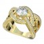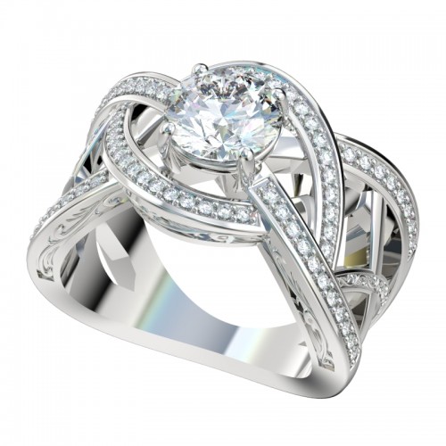 Woven shank reveals relief details and scroll designs along the sides and gallery with bead bright melee settings and 4-prong center.